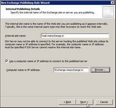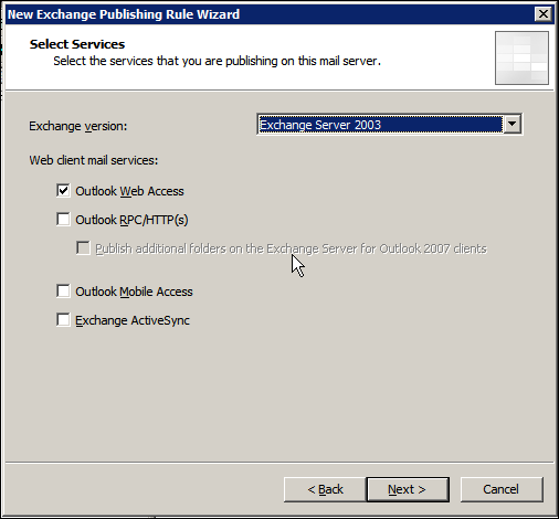 Here we need to select the version of OWA that we need to publish, as in this case we are discussing Exchange 2003 server so we will be selecting Exchange server 2003 from version dropdown list.