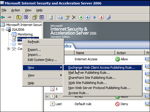 Right click on Firewall in left panel and point towards New > Exchange Web Client Access Publishing Rule